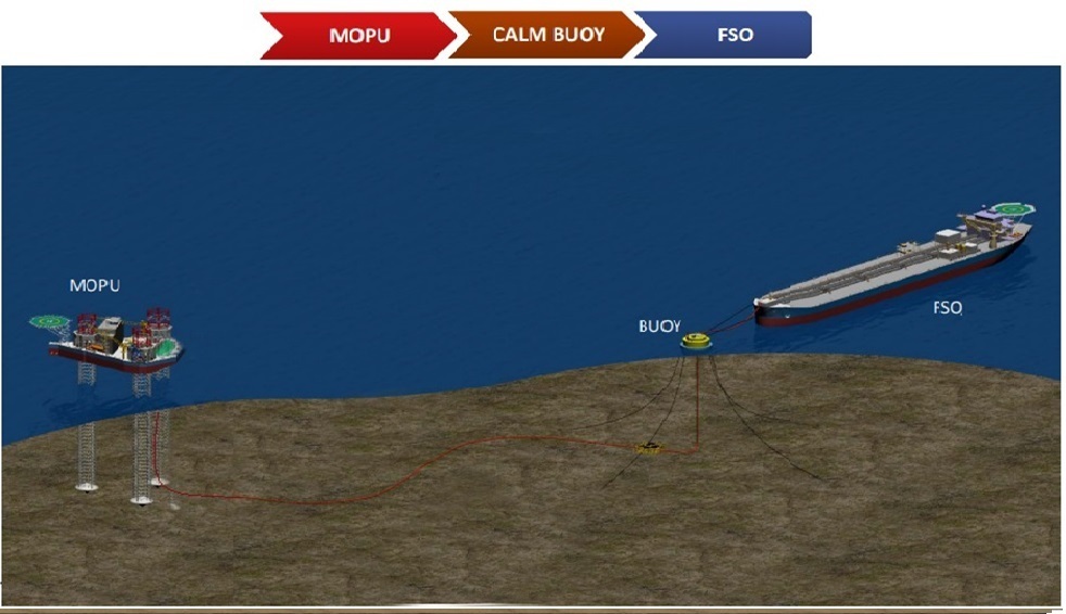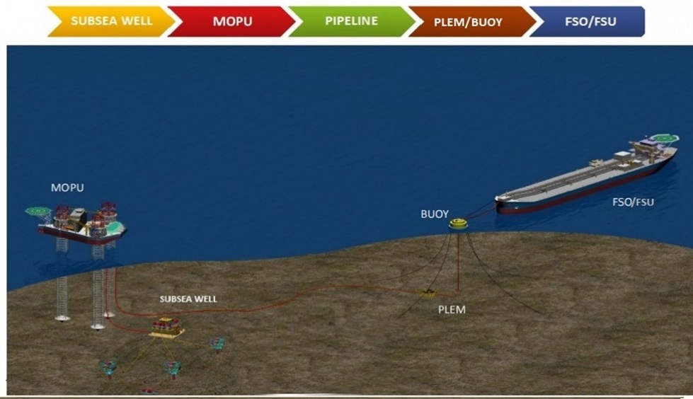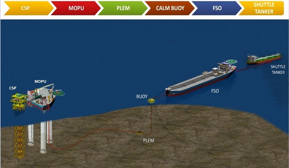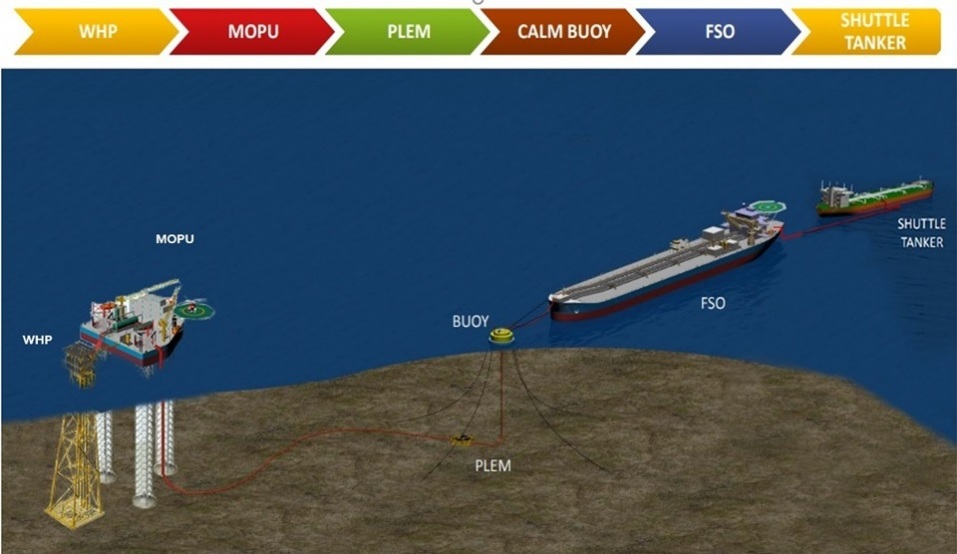 The connections include a pipeline from WHP to MOPU, PLEM to FSO, and FSO to a shuttle tanker.
