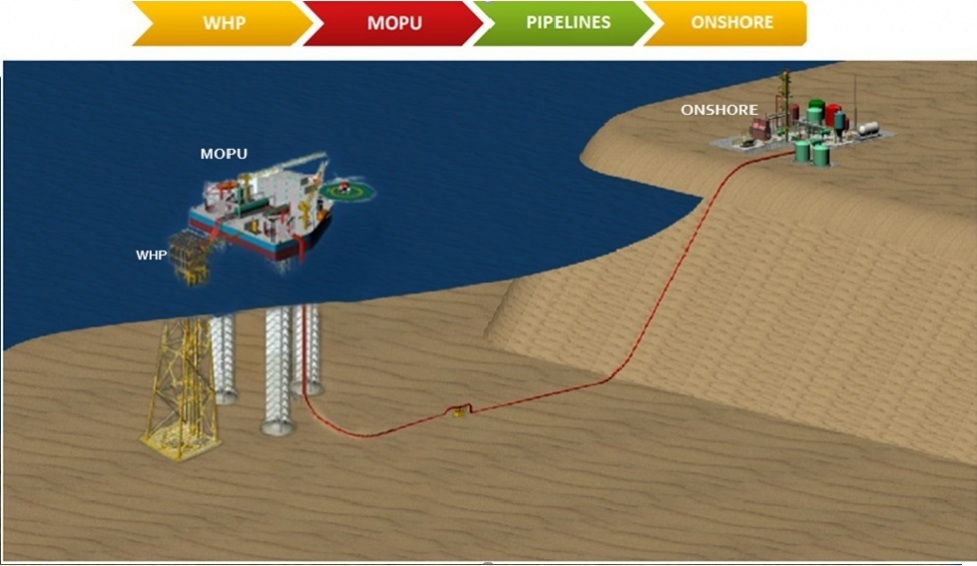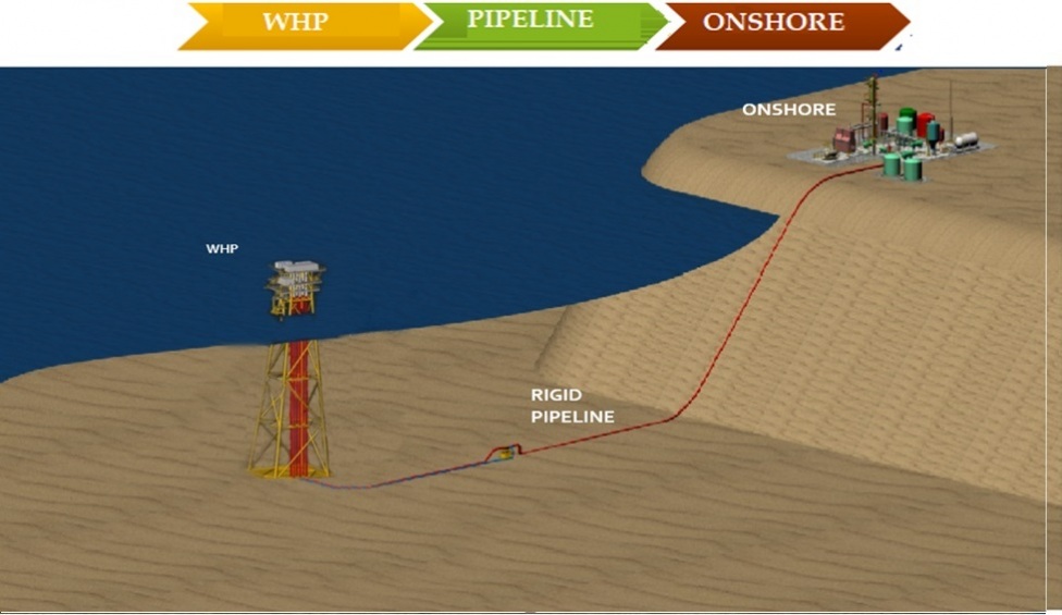 The connections include a pipeline from WHP to Onshore
