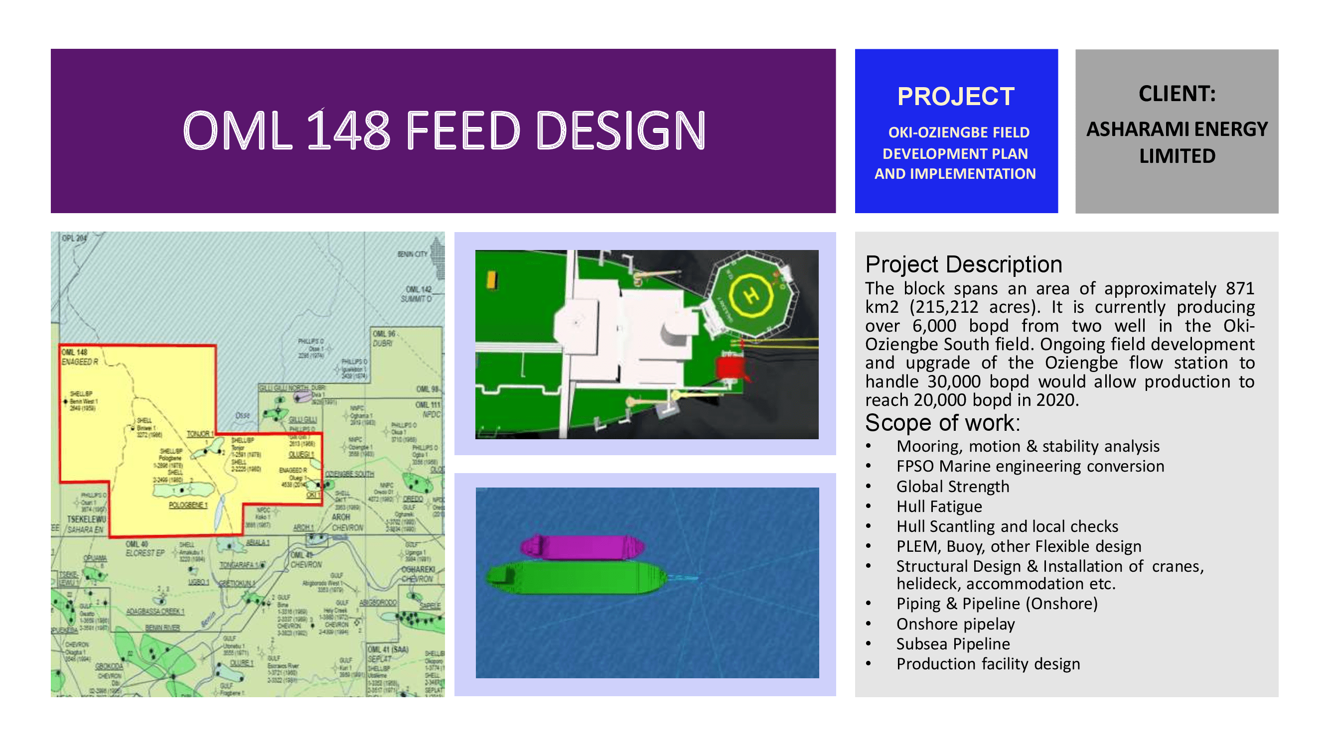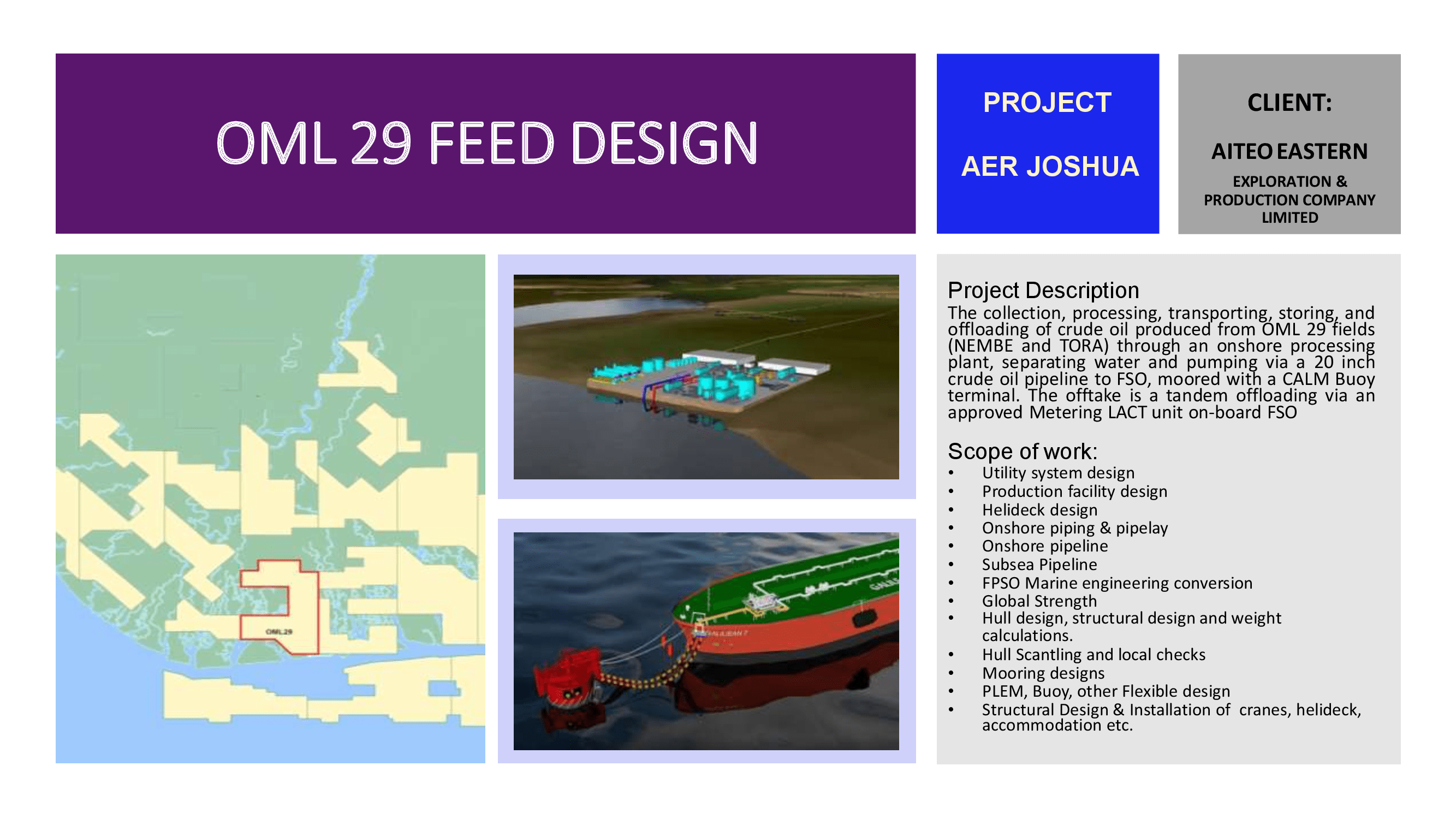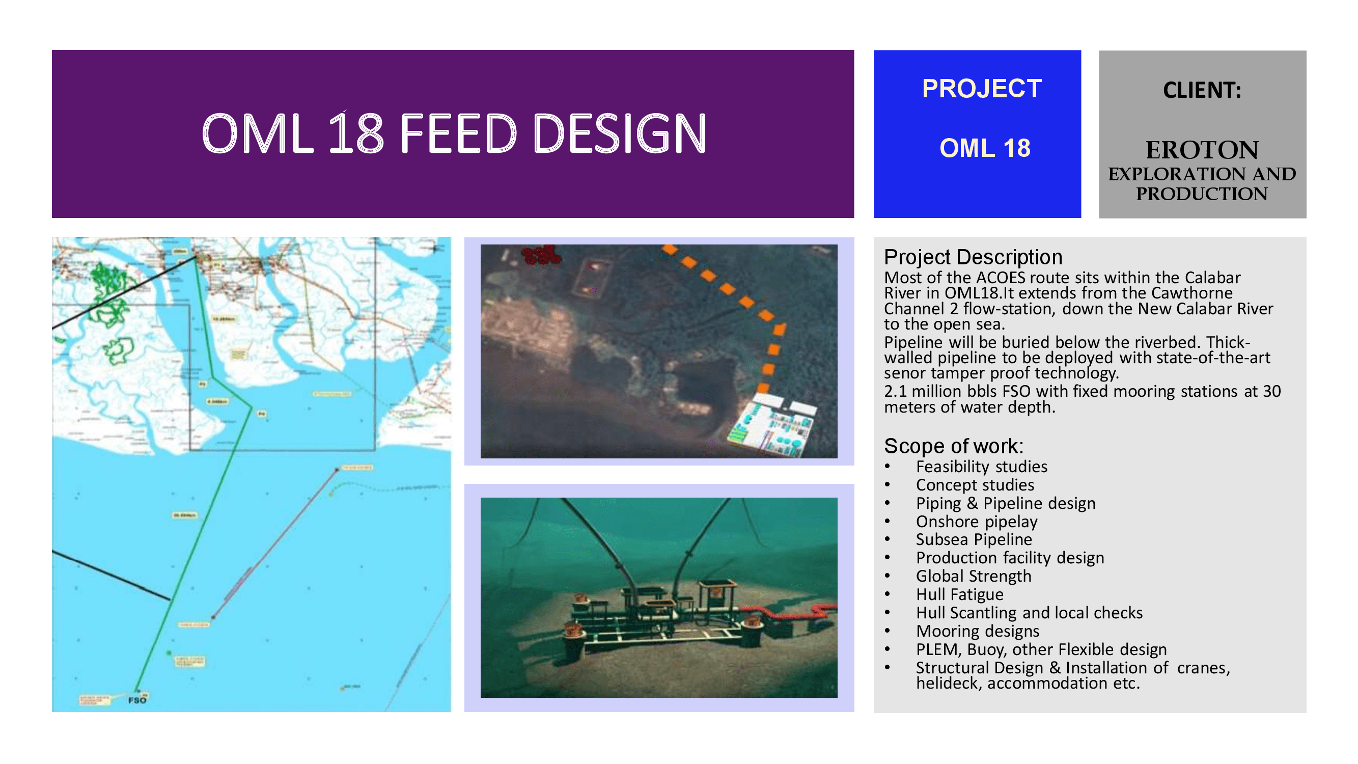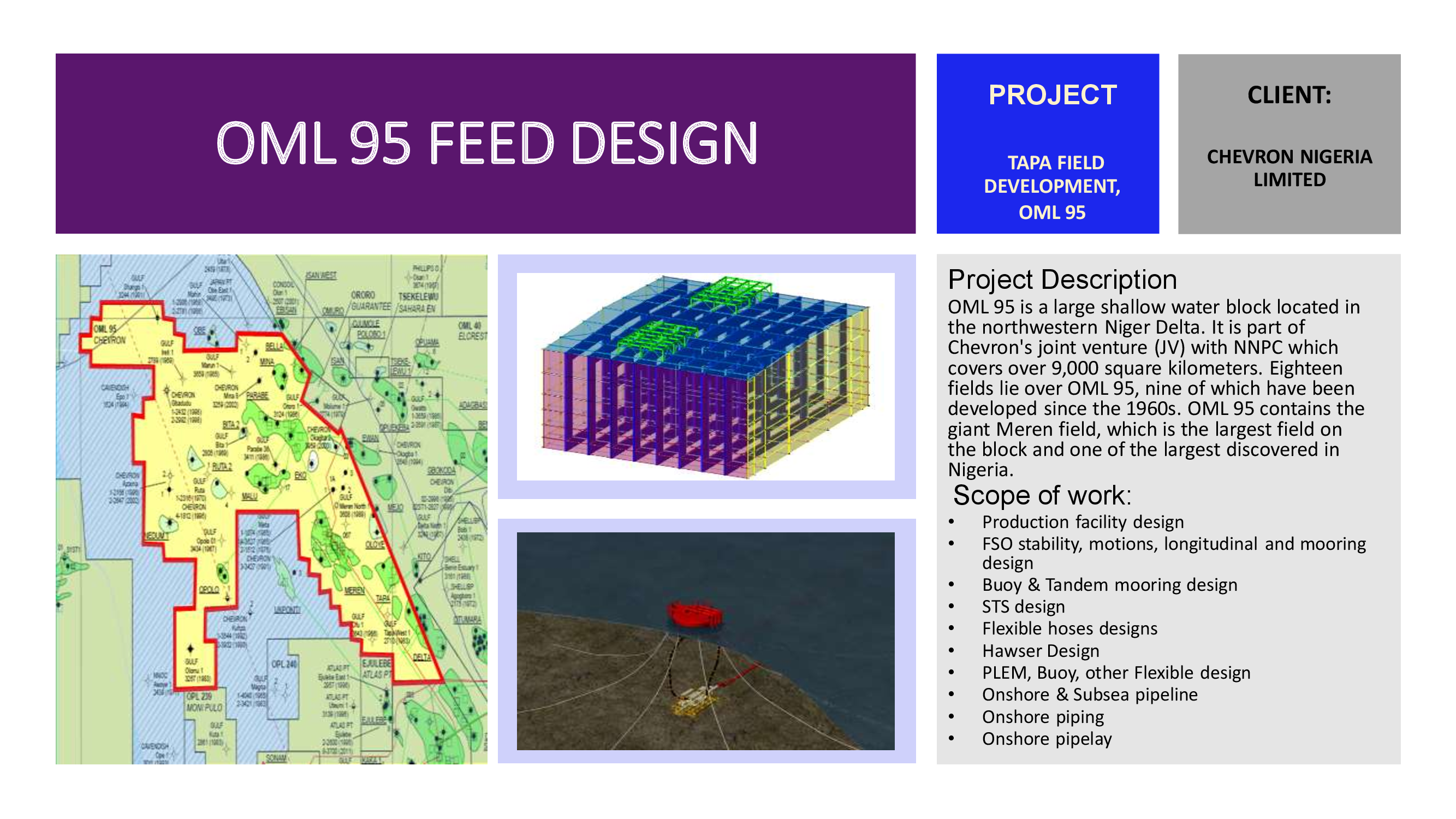 §Platforms, Buoys, and PLEM are designed as per the water depth and topside weight, and in-place, fatigue, and seismic analysis are performed as per API for arriving platform configuration and weight. All installation procedures are verified and analyzed as per MWS & class rules for optimizing the size of the platform.