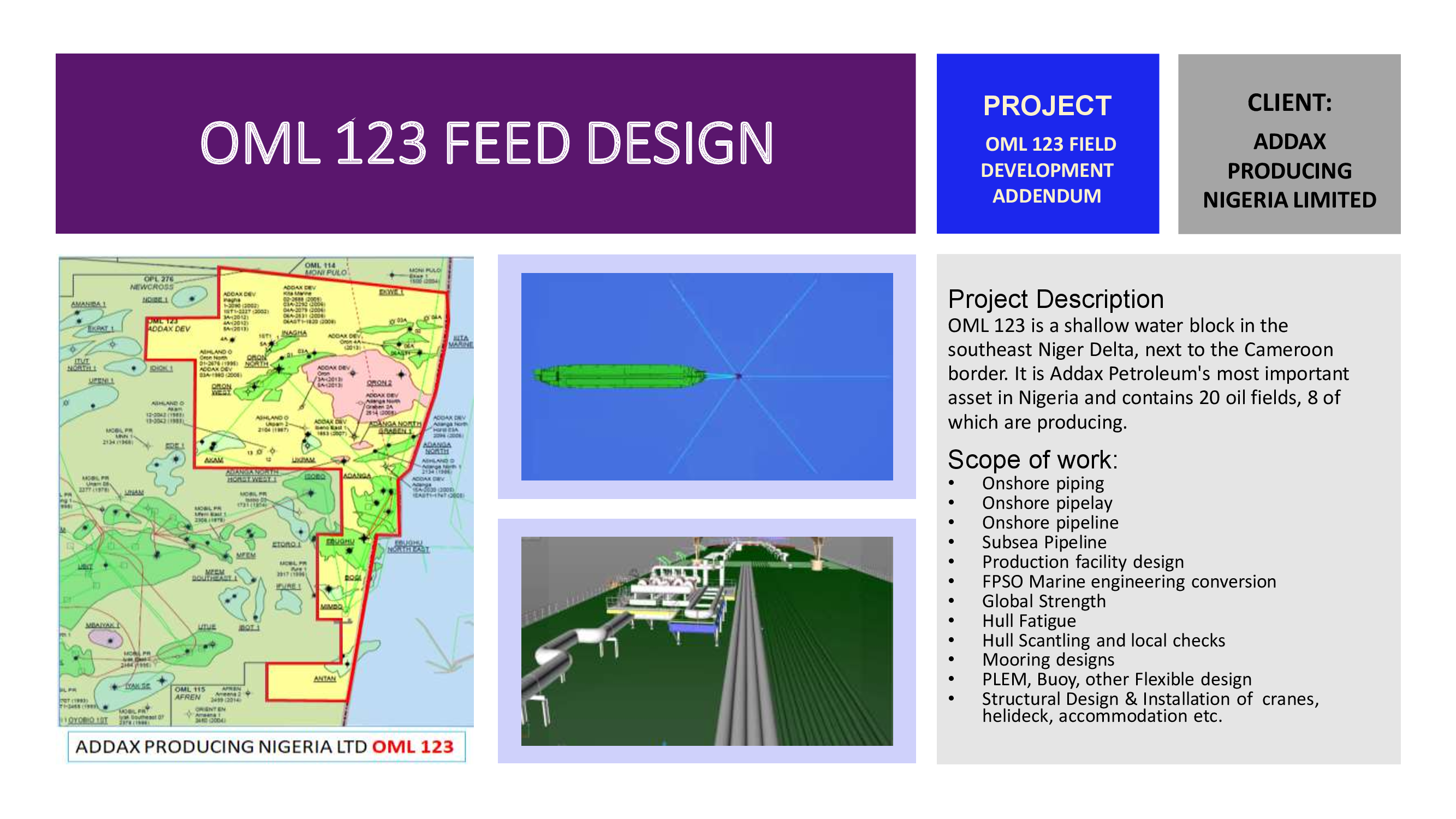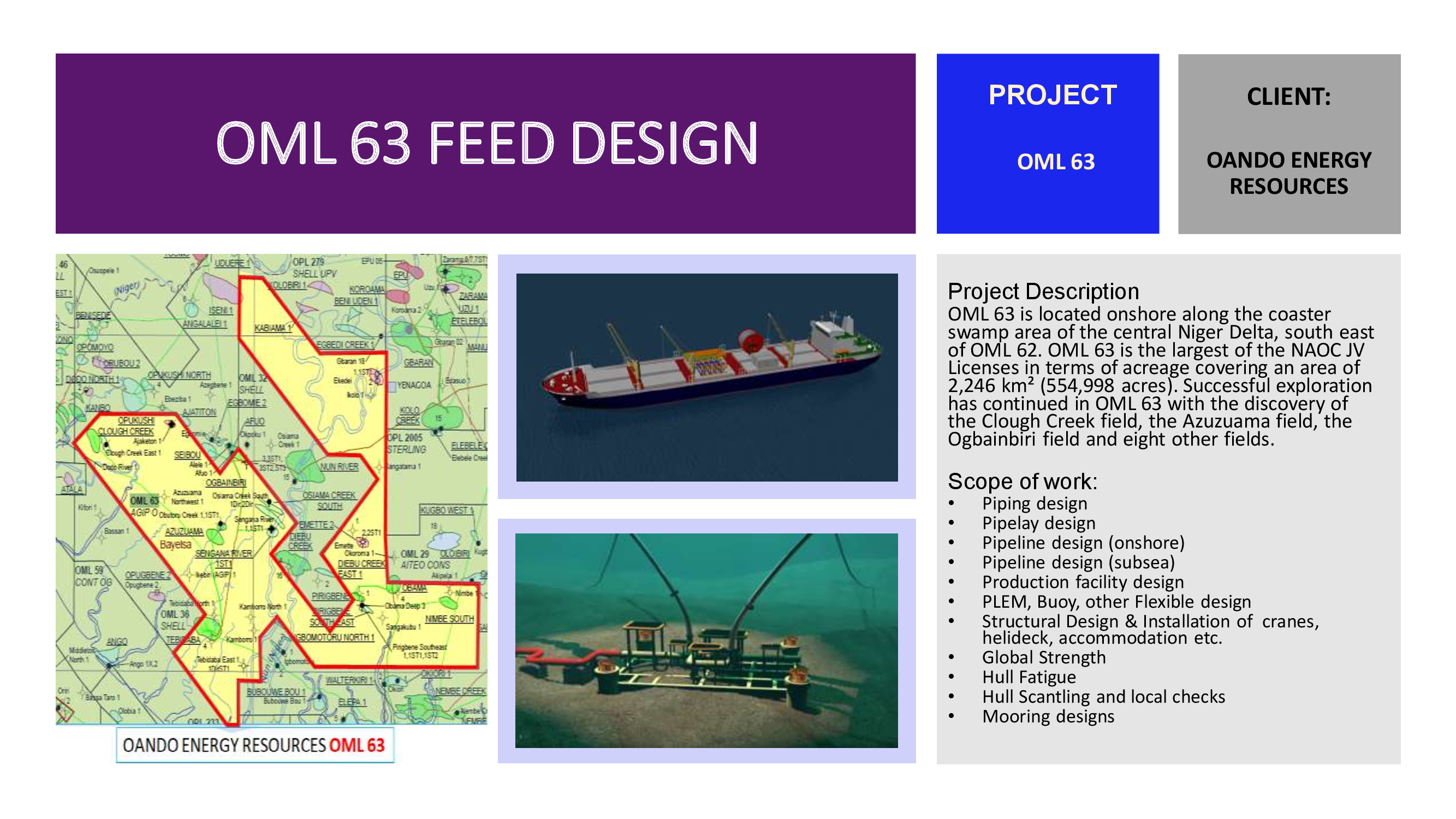 Platforms and PLEM are designed as per the water depth and topside weight and in-place, fatigue, and seismic analysis are performed as per API for arriving platform configuration and weight. All installation procedures are verified and analyzed as per MWS & class rules for optimizing the size of the platform.