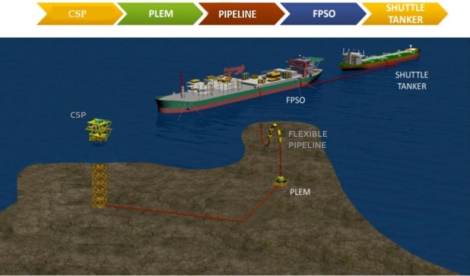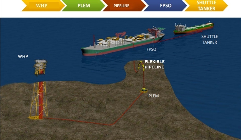 The connections include a pipeline from WHP to PLEM, PLEM to FPSO, and FPSO to shuttle tanker§